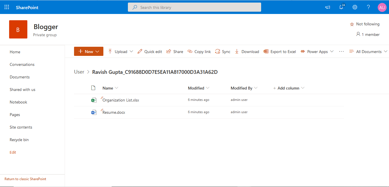 Navigate to SharePoint site. In the left pane select site contents and select employee folder. You will see below window.